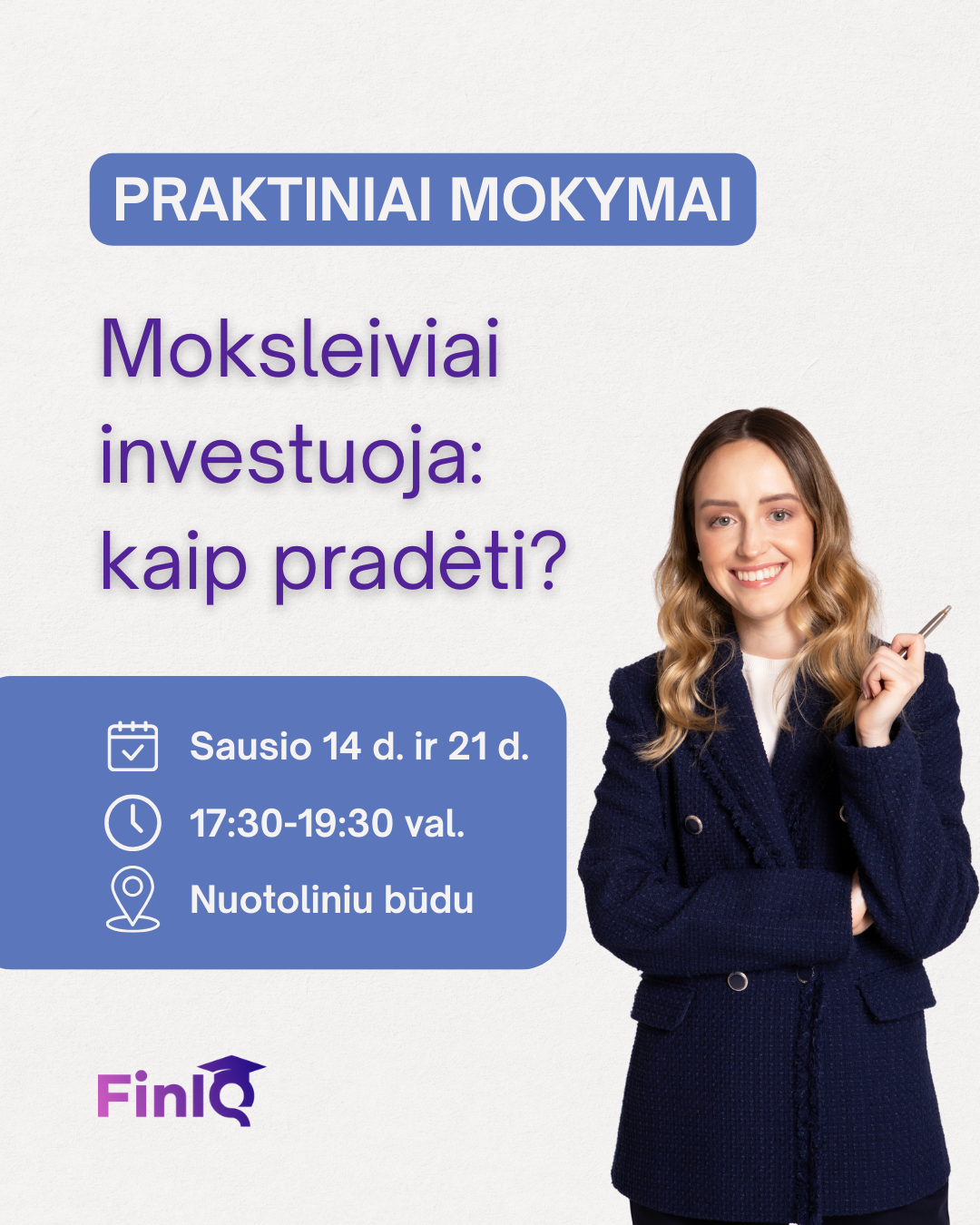 Šie praktiniai mokymai skirti moksleiviams, norintiems sužinoti, kaip ir kur gali investuoti moksleiviai. Prie mokymų rekomenduojame jungtis moksleiviams nuo 14 m. Jei Jums reikalingas mokymų dovanų kuponas, informuokite el. paštu: info@finiq.lt